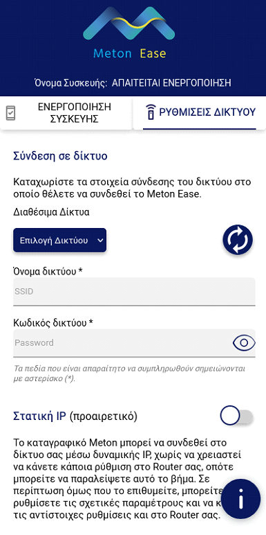 Στα διαθέσιμα δίκτυα εμφανίζεται ένα δίκτυο με όνομα “Meton Ease XXXX”, όπου ”XXXX” είναι οι 4 τελευταίοι χαρακτήρες του σειριακού αριθμού (S/N) της συσκευής.